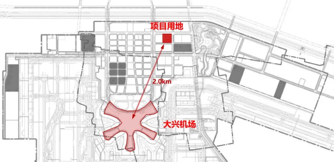 北京大興國際機場生活服務設施二期工程位于北京大興國際機場規劃場地內,航站樓東北側。場地北側規劃為新機場航興路,南側為新機場居泰路,西側為主干三路與生活服務設施一期,東側為新機場航泰路。