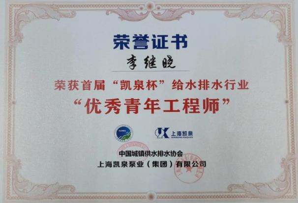 評選對象為全國建筑給水排水和市政供水領(lǐng)域的設(shè)計單位、水務(wù)公司、自來水公司、高校等單位中的杰出青年工程技術(shù)人員。經(jīng)我司推薦,經(jīng)過協(xié)會專家和組委會的嚴格評選,我司李繼曉同志喜獲“凱泉杯”全國優(yōu)秀青年工程師稱號。